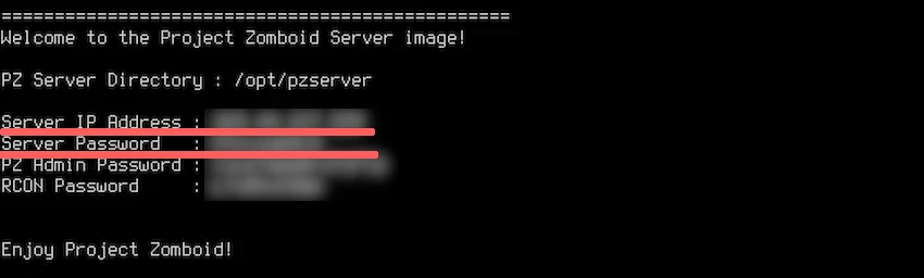 ログインに完了すると、Project Zomboid用のIPアドレスやパスワード等が表示されます。