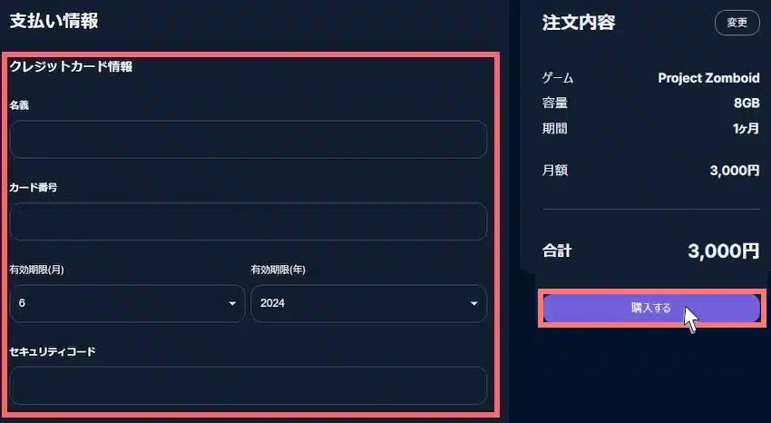 サーバープランなどを選び終えたら「支払い情報入力へ」をクリックします。