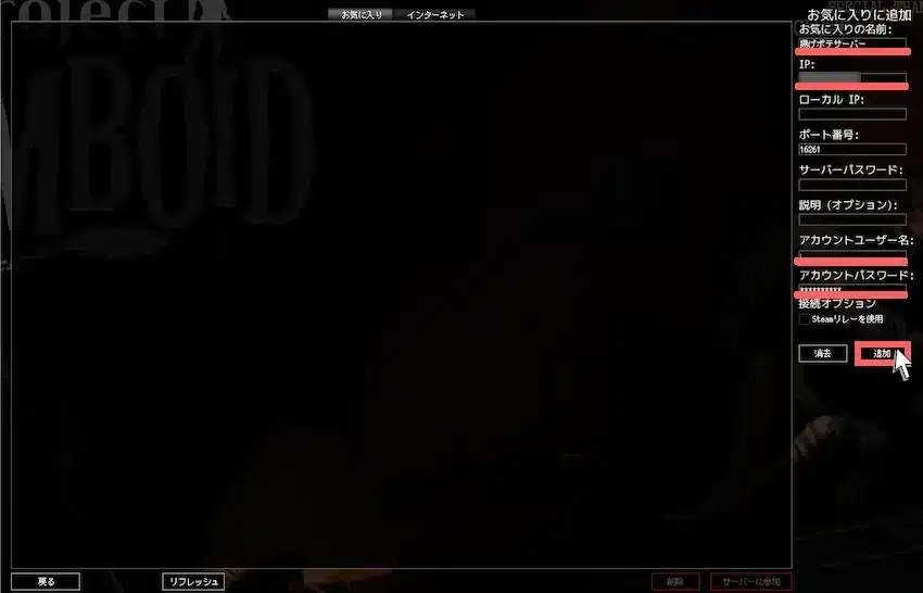 Project Zomboidサーバーの接続時のアカウントユーザー名に「管理者ユーザー名」、アカウントパスワードに「管理者パスワード」を入力すると、管理者ユーザーとして接続できます。