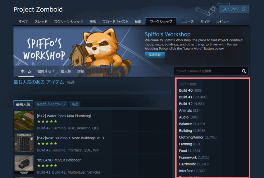 Project ZomboidのMODは、SteamのWorkshop(ワークショップ)から探すことができます。(日本語には対応してないので翻訳必須です)
