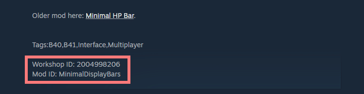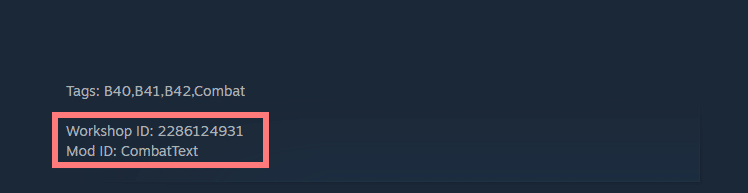MODページを開いて、説明欄の一番下までスクロールすると「Mod ID」と「Workshop ID」が表記されているので、それぞれメモしてください。