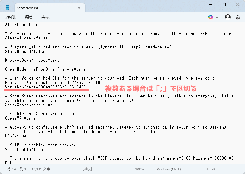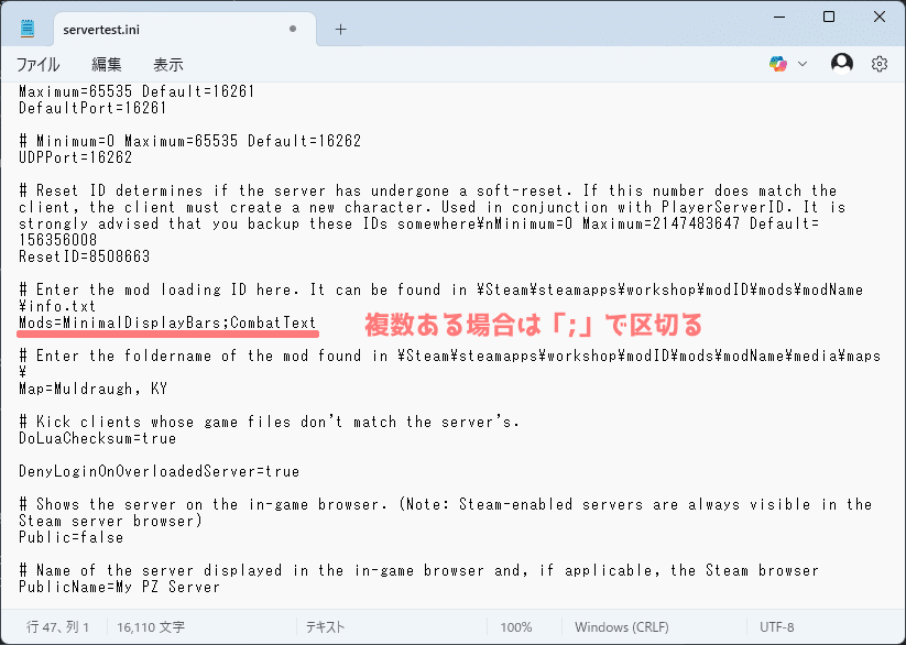その後、メモしたMod IDは「Mods=」、Workshop IDは「WorkshopItems=」に入力してください。複数のMODを入力する場合は「;」で区切る必要があります。