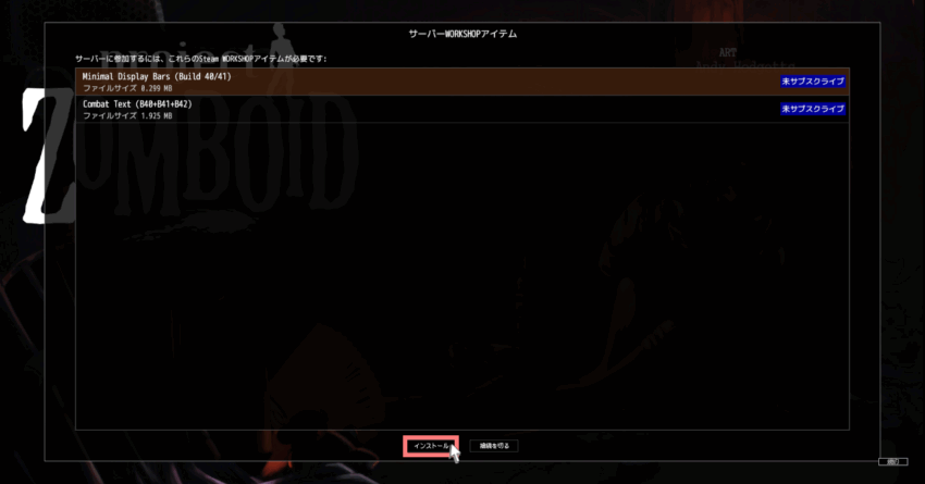 初回参加に限り、サーバーに導入したMODを適用する必要があるため、下部の「インストール」をクリックすると自動的にお使いのProject ZomboidにMODが適用されます。